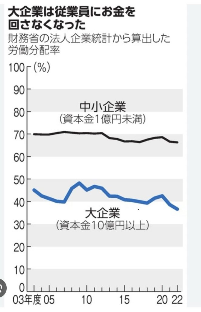 なんで大企業(上場企業)が労働分配率が下がって来ているかと言えば株主分配率が上がっているからです。普通に配当している所で40%ぐらい、人気薄の企業なら70%なんていう会社もある。累積配当制度とか言って儲からなくても配当は下げませんという企業も結構ある。
